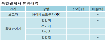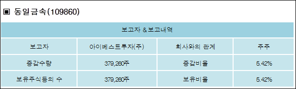 동일금속(109860)은 08일 주주 아이베스트투자(주)를 비롯한 특별관계자의 보유주식이 증가되었다고 발표했다. 이는 직전 보고일보다 379,260주 증가하여 지분율은 5.42%로 상승했다. 이번 보고 사유는 장내매수로 알려졌다.