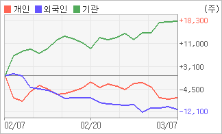 | 외국인과 개인은 순매도, 기관은 순매수(한달누적) 전일 외국인이 940주를 순매도했다. 4주간을 기준으로 보면 기관이 방향성있는 매매를 하면서 18,244주를 순매수한 반면, 외국인은 매도 우위를 지속하면서 11,160주를 순매도했고, 개인들도 매도쪽으로 방향을 잡으면서 7,286주를 순매도했다. |