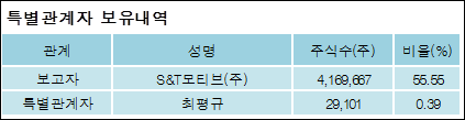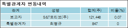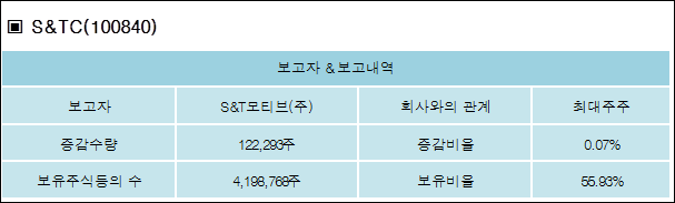 S&TC(100840)는 08일 최대주주 S&T모티브(주)를 비롯한 특별관계자의 보유주식이 증가되었다고 발표했다. 이는 직전 보고일보다 122,293주 증가하여 지분율은 55.93%로 상승했다. 이번 보고 사유는 보유주식수변동으로 알려졌다.