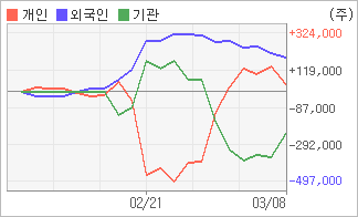| 외국인/개인 순매수, 기관은 순매도(한달누적) 3월7일부터 전일까지 외국인이 2거래일 연속 순매도했다. 4주간을 기준으로 보면 외국인이 매수 우위를 유지하면서 189,517주를 순매수했고, 개인들도 매수반전의 모습을 보이며 43,901주를 순매수했다. 하지만 기관은 순매수에서 순매도로 반전되면서 233,418주를 순매도했다. |
