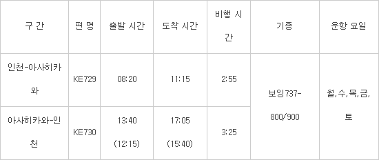 이번 대한항공이 주5회 운항하는 '인천~아사히카와' 노선(KE729)은 매주 월·수·목·금·토요일 오전 8시 20분 인천공항을 출발해 현지에 11시15분 도착한다. '아사히카와~인천' 노선(KE730)은 오후 1시 40분에 출발(토요일은 12시15분)해 오후 5시 05분(토요일은 오후 3시 40분) 인천에 도착한다.