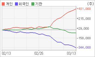 | 외국인과 기관은 순매도, 개인은 순매수(한달누적) 전일까지 외국인이 3일 연속, 기관이 4일 연속 각각 동종목을 순매도 했다. 4주간을 기준으로 보면 외국인이 매도 우위를 지속하면서 343,639주를 순매도했고, 기관도 순매수에서 순매도로 반전되면서 56,978주를 순매도했지만, 개인은 오히려 순매수량을 늘리며 400,640주를 순매수했다. |