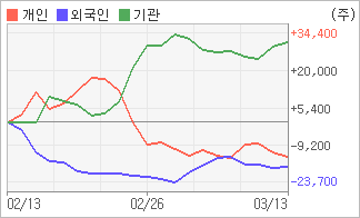 | 외국인과 개인은 순매도, 기관은 순매수(한달누적) 전일 기관이 1,389주를 순매수했고, 외국인은 424주를 순매도했다. 4주간을 기준으로 보면 기관이 방향성있는 매매를 하면서 30,973주를 순매수한 반면, 외국인은 매도 후 매수의 관점을 보이고 있음에도 불구하고 17,346주를 순매도했고, 개인들도 매도쪽으로 방향을 잡으면서 13,627주를 순매도했다. |