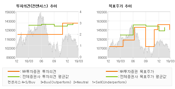 | 의견제시일자 | 증권사 | 투자의견 | 목표가 | | 20190315 | NH투자증권 | BUY(유지) | 145,000 | | 20190227 | 하나금융투자 | BUY | 160,000 | | 20190225 | 한국투자증권 | 매수(유지) | 150,000 | | 20190215 | 흥국증권 | BUY(유지) | 160,000 |