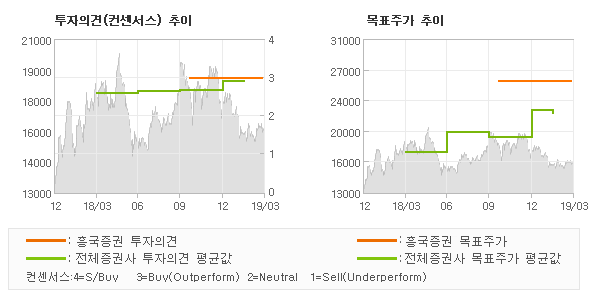 | 의견제시일자 | 증권사 | 투자의견 | 목표가 | | 20190328 | 흥국증권 | BUY(유지) | 26,000 | | 20190325 | KB증권 | BUY(유지) | 22,000 | | 20190321 | 신한금융투자 | BUY(유지) | 21,500 | | 20190314 | 한국투자증권 | BUY(유지) | 21,000 |