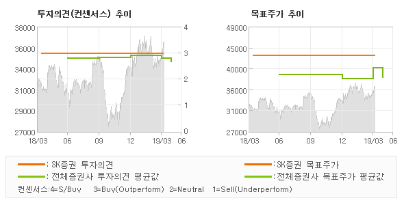 | 의견제시일자 | 증권사 | 투자의견 | 목표가 | | 20190404 | SK증권 | BUY(유지) | 43,000 | | 20190402 | 흥국증권 | BUY | 40,000 | | 20190402 | DB금융투자 | HOLD | 32,000 | | 20190328 | 유진투자증권 | BUY(유지) | 42,000 |