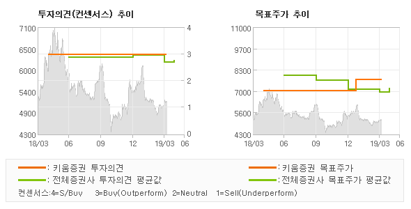 | 의견제시일자 | 증권사 | 투자의견 | 목표가 | | 20190404 | 키움증권 | BUY(유지) | 7,700 | | 20190402 | 흥국증권 | BUY(유지) | 7,000 | | 20190402 | SK증권 | BUY(유지) | 8,000 | | 20190401 | KB증권 | HOLD | 5,800 |