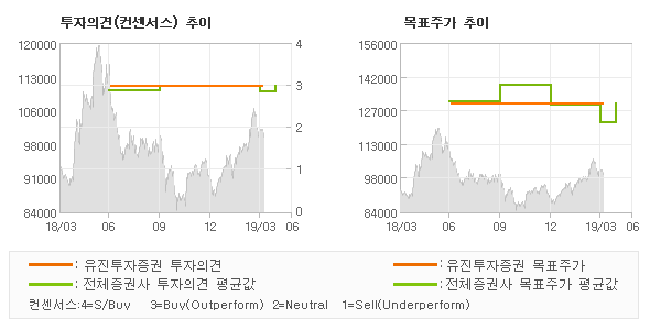 | 의견제시일자 | 증권사 | 투자의견 | 목표가 | | 20190404 | 유진투자증권 | BUY(유지) | 130,000 | | 20190326 | 하나금융투자 | NEUTRAL | 110,000 | | 20190326 | 교보증권 | TRADING BUY(유지) | 120,000 | | 20190320 | 한국투자증권 | BUY(유지) | 150,000 |
