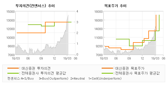 | 의견제시일자 | 증권사 | 투자의견 | 목표가 | | 20190404 | 대신증권 | BUY(유지) | 17,000 | | 20190321 | 미래에셋대우 | BUY(유지) | 17,000 | | 20190305 | 신한금융투자 | BUY(유지) | 13,000 |