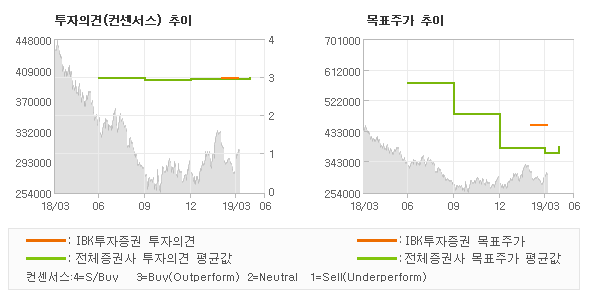 | 의견제시일자 | 증권사 | 투자의견 | 목표가 | | 20190404 | IBK투자증권 | BUY(유지) | 450,000 | | 20190404 | 삼성증권 | BUY | 360,000 | | 20190401 | 흥국증권 | BUY | 390,000 | | 20190329 | 유안타증권 | BUY | 400,000 |
