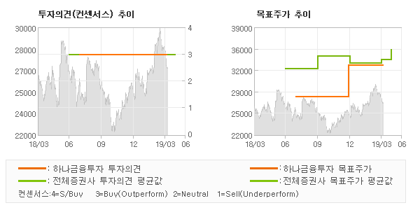 | 의견제시일자 | 증권사 | 투자의견 | 목표가 | | 20190404 | 하나금융투자 | BUY | 33,000 | | 20190403 | DB금융투자 | BUY | 38,000 | | 20190402 | 흥국증권 | BUY | 35,000 | | 20190402 | 대신증권 | BUY(유지) | 36,000 |