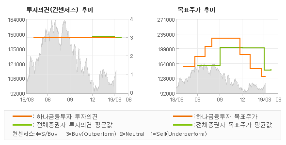 하나금융투자의 동종목에 대한 최근 1년동안의 투자의견은 전체적으로 큰 변화없이 유지되고 있다. 목표주가는 2018년8월 225,000원까지 높아졌다가 2019년3월 132,000원을 최저점으로 목표가가 제시된 이후 최근에도 132,000원으로 제시되고 있다.