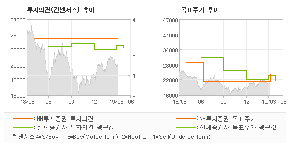 | 의견제시일자 | 증권사 | 투자의견 | 목표가 | | 20190404 | NH투자증권 | BUY(유지) | 24,000 | | 20190401 | BNK투자증권 | 보유(유지) | 19,000 | | 20190326 | 하이투자증권 | HOLD(유지) | 23,000 | | 20190321 | DB금융투자 | BUY(유지) | 28,000 |