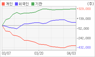 | 외국인/기관 순매수, 개인은 순매도(한달누적) 기관이 6일연속 순매수를 보이고 있는 반면에 외국인은 4일연속 순매도를 보이고 있다. 4주간을 기준으로 보면 외국인이 초반에 동종목을 순매수한 이후에 기세를 이어가며 63,699주를 순매수했고, 기관도 방향성있는 매매를 하면서 328,923주를 순매수했다. 반면 개인들은 매도쪽으로 방향을 잡으면서 387,976주를 순매도한 것으로 나타났다. |