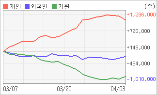 | 외국인과 기관은 순매도, 개인은 순매수(한달누적) 4월2일부터 전일까지 외국인이 2거래일 연속 순매수를 보였다. 4주간을 기준으로 보면 외국인이 매도 우위를 지속하면서 195,870주를 순매도했고, 기관도 매도 관점으로 접근하면서 897,744주를 순매도했지만, 개인은 오히려 순매수량을 늘리며 1,115,047주를 순매수했다. |