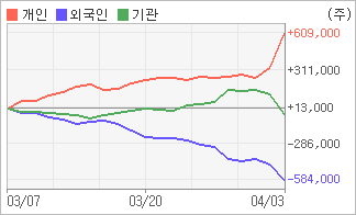 | 외국인과 기관은 순매도, 개인은 순매수(한달누적) 4월2일부터 전일까지 기관과 외국인은 2거래일연속 동반 순매도했다. 4주간을 기준으로 보면 외국인이 매도 우위를 지속하면서 583,078주를 순매도했고, 기관도 매도 관점으로 접근하면서 43,734주를 순매도했지만, 개인은 오히려 순매수량을 늘리며 608,672주를 순매수했다. |