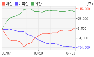 | 기관/개인 순매수, 외국인은 순매도(한달누적) 3월27일부터 전일까지 외국인이 6거래일 연속 동종목을 내다 팔았다. 4주간을 기준으로 보면 기관이 방향성있는 매매를 하면서 123,310주를 순매수했고, 개인들도 매수반전의 모습을 보이며 9,375주를 순매수했다. 반면 그 동안 외국인은 매도 우위를 지속하면서 133,172주를 순매도했다. |