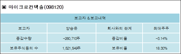 마이크로컨텍솔(098120)은 04일 최대주주 양승은을 비롯한 특별관계자의 보유주식이 감소되었다고 발표했다. 이는 직전 보고일보다 260,710주 감소하여 지분율은 18.3%로 하락했다. 이번 보고 사유는 임원의퇴임으로 알려졌다.