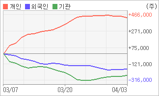 | 외국인과 기관은 순매도, 개인은 순매수(한달누적) 4월1일부터 전일까지 외국인이 3거래일 연속 순매수를 보였다. 4주간을 기준으로 보면 외국인이 매도 우위를 지속하면서 181,736주를 순매도했고, 기관도 매도 우위를 보이면서 253,253주를 순매도했지만, 개인은 오히려 순매수량을 늘리며 433,872주를 순매수했다. |