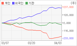 | 기관과 개인은 순매도, 외국인은 순매수(한달누적) 4월2일부터 전일까지 기관이 2거래일 연속 순매도를 보였다. 4주간을 기준으로 보면 외국인이 초반에 동종목을 순매수한 이후에 기세를 이어가며 224,727주를 순매수한 반면, 기관은 매도 관점으로 접근하면서 23,418주를 순매도했고, 개인들도 매도쪽으로 방향을 잡으면서 199,693주를 순매도한 것으로 집계됐다. |