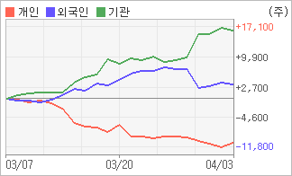| 외국인/기관 순매수, 개인은 순매도(한달누적) 전일 외국인과 기관이 각각 536주, 720주를 순매수 했다. 4주간을 기준으로 보면 외국인이 매수 우위를 유지하면서 3,332주를 순매수했고, 기관도 방향성있는 매매를 하면서 16,283주를 순매수했다. 반면 개인들은 매도쪽으로 방향을 잡으면서 10,506주를 순매도한 것으로 나타났다. |