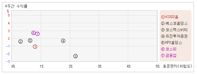 | 업종평균에 비해서 변동폭 대비 수익률은 다소 부정적 4일 오후 2시5분 현재 전일대비 1.48% 하락하면서 13,300원을 기록하고 있는 KISCO홀딩스는 지난 1개월간 1.85% 하락했다. 같은 기간동안 변동성의 크기를 말해주는 표준편차는 0.8%를 기록했다. 이는 금융업 업종내에서 주요종목들과 비교해볼 때 KISCO홀딩스의 월간 변동성은 주요종목군 내에서 중간 수준이었으나 주가등락률은 상대적으로나 절대적으로 낮은 수준을 유지했다는 것이다. 최근 1개월을 기준으로 KISCO홀딩스의 위험을 고려한 수익률은 -2.3을 기록했는데, 주가 약세와 더불어 위험대비 수익률도 부진을 면치 못했다. 게다가 금융업업종의 위험대비수익률인 1.2보다도 낮기 때문에 업종대비 성과도 긍정적이라고 할 수 없다. 다음으로 업종과 시장을 비교해보면 KISCO홀딩스가 속해 있는 금융업업종은 코스피지수보다 변동성은 높고, 수익률은 낮은 모습을 보여주고 있다. 다시 말해서 동업종은 지수보다 크게 오르락 내리락 했지만, 상승률은 오히려 지수보다 못하다는 의미이다. |