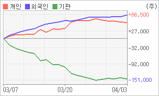 | 외국인/개인 순매수, 기관은 순매도(한달누적) 3월22일부터 외국인들이 9거래일 연속 순매수 행진을 벌이고 있다. 4주간을 기준으로 보면 외국인이 초반에 동종목을 순매수한 이후에 기세를 이어가며 86,462주를 순매수했고, 개인들도 매기를 떨어뜨리면서도 58,657주를 순매수했다. 하지만 기관은 매도 관점으로 접근하면서 144,499주를 순매도했다. |