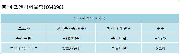 에프앤리퍼블릭(064090)은 04일 주주 한국투자증권(주)의 보유주식이 감소되었다고 발표했다. 이는 직전 보고일보다 960,211주 감소하여 지분율은 5.28%로 하락했다. 이번 보고 사유는 단순투자목적의매매에 따른 변동보고로 알려졌다.