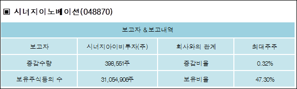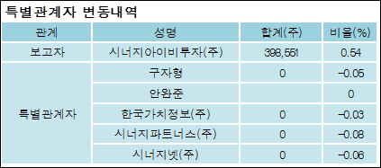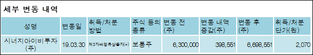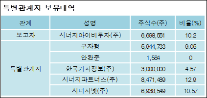 다음은 시너지이노베이션의 지분 변동 내역과 보유 내역이다.