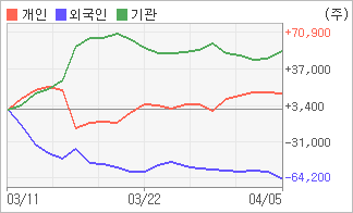 | 기관/개인 순매수, 외국인은 순매도(한달누적) 기관이 2일연속 순매수를 보이고 있는 반면에 외국인은 2일연속 순매도를 보이고 있다. 4주간을 기준으로 보면 기관이 방향성있는 매매를 하면서 54,464주를 순매수했고, 개인들도 순매수량을 늘리며 14,856주를 순매수했다. 반면 그 동안 외국인은 매도 우위를 지속하면서 64,119주를 순매도했다. |