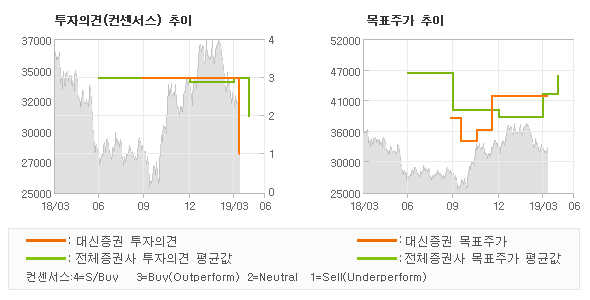 | 의견제시일자 | 증권사 | 투자의견 | 목표가 | | 20190408 | 대신증권 | OVERWEIGHT | 42,000 | | 20190403 | SK증권 | BUY(유지) | 49,000 | | 20190328 | 하나금융투자 | BUY | 43,000 | | 20190328 | 한국투자증권 | BUY(유지) | 39,000 |
