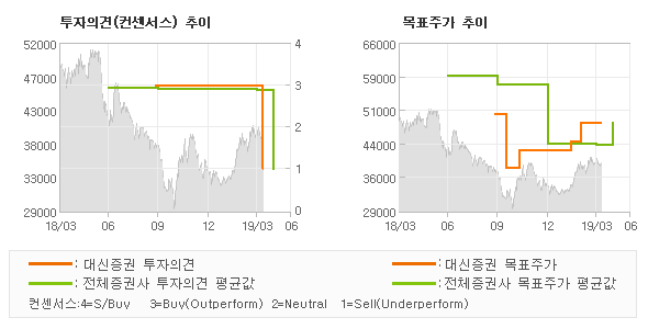 대신증권의 동종목에 대한 최근 6개월 동안의 투자의견은 전체적으로 하향조정되고 있다. 목표주가는 2018년9월 50,000원까지 높아졌다가 2018년10월 38,000원을 최저점으로 목표가가 제시된 이후 최근에 48,000원으로 새롭게 조정되고 있다.