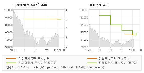 | 의견제시일자 | 증권사 | 투자의견 | 목표가 | | 20190408 | 한화투자증권 | BUY(유지) | 90,000 | | 20190408 | 유진투자증권 | BUY(유지) | 84,000 | | 20190408 | 대신증권 | BUY(유지) | 90,000 | | 20190408 | 삼성증권 | BUY | 89,000 |
