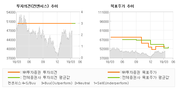 | 의견제시일자 | 투자의견 | 목표가격 | | 20190405 | BUY(유지) | 55,000 | | 20190322 | BUY(유지) | 55,000 | | 20190311 | BUY(유지) | 55,000 | | 20190201 | BUY(유지) | 55,000 |