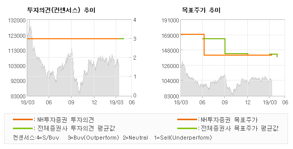 | 의견제시일자 | 증권사 | 투자의견 | 목표가 | | 20190408 | NH투자증권 | BUY(유지) | 140,000 | | 20190401 | 신한금융투자 | BUY(유지) | 135,000 | | 20190201 | 대신증권 | BUY | 145,000 | | 20190201 | 삼성증권 | BUY | 134,000 |