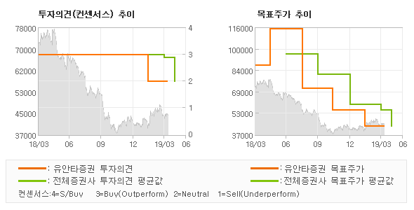 | 의견제시일자 | 증권사 | 투자의견 | 목표가 | | 20190408 | 유안타증권 | HOLD | 43,000 | | 20190325 | 대신증권 | BUY(유지) | 64,000 | | 20190304 | 신한금융투자 | 매수(유지) | 51,500 | | 20190214 | 현대차증권 | MARKETPERFORM | 45,000 |