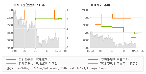| 의견제시일자 | 증권사 | 투자의견 | 목표가 | | 20190408 | 유안타증권 | BUY(유지) | 6,500 | | 20190311 | 한화투자증권 | BUY(유지) | 7,000 | | 20190304 | 대신증권 | BUY | 8,200 | | 20190304 | 한국투자증권 | 매수(유지) | 6,800 |