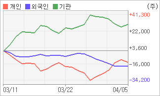 | 외국인과 개인은 순매도, 기관은 순매수(한달누적) 전일 기관이 2,385주를 순매수했고, 외국인은 201주를 순매도했다. 4주간을 기준으로 보면 기관이 방향성있는 매매를 하면서 30,139주를 순매수한 반면, 외국인은 매도 우위를 지속하면서 17,616주를 순매도했고, 개인들도 초반에 동종목을 순매도한 이후에 근래에는 순매도량을 줄이면서 12,817주를 순매도했다. |