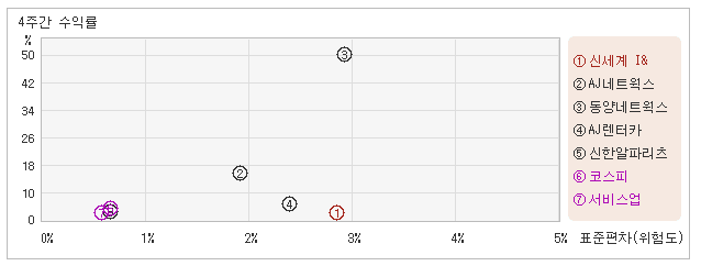 | 관련종목들 가운데서 변동폭은 높지만 수익률은 작아 8일 오전 11시5분 현재 전일대비 4.76% 오른 154,000원을 기록하고 있는 신세계 I&C는 지난 1개월간 1.32% 상승했다. 동기간 동안에 주가움직임의 위험지표인 표준편차는 2.8%를 기록했다. 이는 코스피 업종내에서 주요종목들과 비교해볼 때 신세계 I&C의 월간 변동성이 상대적으로 컸음에도 불구하고 주가상승률은 가장 낮은 수준을 유지했다는 뜻이다. 최근 1개월을 기준으로 신세계 I&C의 위험을 고려한 수익률은 0.4를 기록했는데, 변동성이 높은 수준을 유지했기 때문에 위험대비 수익률은 가장 저조했다. 게다가 코스피업종의 위험대비수익률 5.8보다도 낮기 때문에 업종대비 성과도 좋지 않았다고 할 수 있다. 다음으로 업종과 시장을 비교해보면 신세계 I&C가 속해 있는 코스피업종은 서비스업지수보다 변동성과 수익률이 모두 높은 모습이다. 다시 말하면 동업종에 탄력이 붙으면서 지수대비 초과상승했다는 의미이다. |
