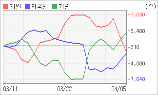 | 외국인과 개인은 순매도, 기관은 순매수(한달누적) 4월4일부터 전일까지 기관과 외국인은 2거래일 연속 동반 순매수를 보였다. 4주간을 기준으로 보면 기관이 순매도를 기록하다가 다시 순매수로 돌아서면서 2,885주를 순매수한 반면, 외국인은 순매도로 돌아서면서 1,790주를 순매도했고, 개인들도 매도 우위로 반전되면서 1,213주를 순매도했다. |