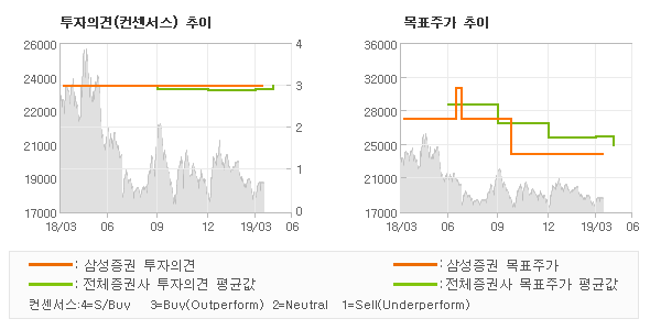 | 의견제시일자 | 증권사 | 투자의견 | 목표가 | | 20190411 | 삼성증권 | BUY | 23,500 | | 20190410 | 하나금융투자 | BUY | 27,000 | | 20190401 | SK증권 | BUY(유지) | 23,000 | | 20190306 | 하이투자증권 | BUY(유지) | 28,600 |
