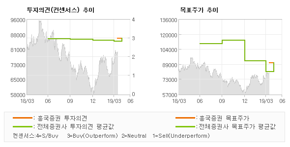 | 의견제시일자 | 증권사 | 투자의견 | 목표가 | | 20190411 | 흥국증권 | BUY(유지) | 90,000 | | 20190410 | 삼성증권 | BUY | 88,000 | | 20190403 | 골든브릿지투자증권 | BUY(유지) | 96,000 | | 20190401 | BNK투자증권 | BUY(유지) | 83,000 |