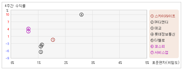 | 업종지수와 비교해서 변동폭 대비 수익률은 좋다고 할 수 없어 11일 오후 1시20분 현재 전일대비 2.09% 오른 12,200원을 기록하고 있는 스카이라이프는 지난 1개월간 2.02% 하락했다. 동기간 동안 주가움직임의 위험지표인 표준편차는 1.5%를 기록했다. 이는 코스피 업종내에서 주요종목들과 비교해볼 때 스카이라이프의 주가가 월간기준으로 선방하는 모습을 보였지만 변동성도 다소 높은 수준을 유지했다는 뜻이다. 최근 1개월을 기준으로 스카이라이프의 위험을 고려한 수익률은 -1.3을 기록했는데, 변동성은 높았으나 주가가 상대적으로 선방하는 모습을 보였기 때문에 위험대비 수익률은 높은 수준을 유지했다. 다만 코스피업종의 위험대비수익률 5.6보다는 낮았기 때문에 업종대비 성과는 뛰어났다고 할 수 없다. 다음으로 업종과 시장을 비교해보면 스카이라이프가 속해 있는 코스피업종은 서비스업지수보다 변동성과 수익률이 모두 높은 모습이다. 다시 말하면 동업종에 탄력이 붙으면서 지수대비 초과상승했다는 의미이다. |
