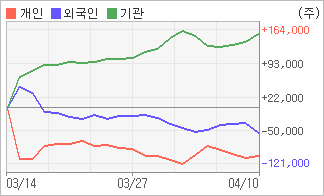 | 외국인과 개인은 순매도, 기관은 순매수(한달누적) 4월8일부터 전일까지 기관이 3거래일 연속 순매수했다. 4주간을 기준으로 보면 기관이 방향성있는 매매를 하면서 156,058주를 순매수한 반면, 외국인은 매도 우위를 지속하면서 53,128주를 순매도했고, 개인들도 매도쪽으로 방향을 잡으면서 102,660주를 순매도했다. |