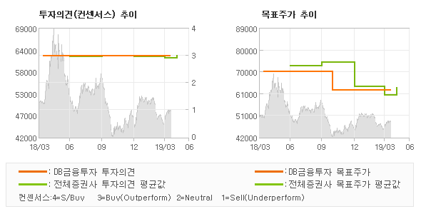 | 의견제시일자 | 증권사 | 투자의견 | 목표가 | | 20190415 | DB금융투자 | BUY(유지) | 62,000 | | 20190409 | 미래에셋대우 | BUY(유지) | 64,000 | | 20190329 | SK증권 | BUY(유지) | 64,000 | | 20190325 | 대신증권 | BUY(유지) | 57,000 |
