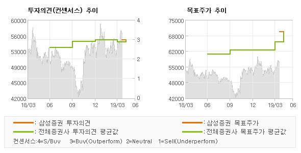 | 의견제시일자 | 증권사 | 투자의견 | 목표가 | | 20190416 | 삼성증권 | BUY | 70,000 | | 20190306 | 하이투자증권 | BUY(유지) | 64,000 | | 20190212 | 미래에셋대우 | 매수 | 74,000 | | 20190208 | NH투자증권 | BUY(유지) | 65,000 |