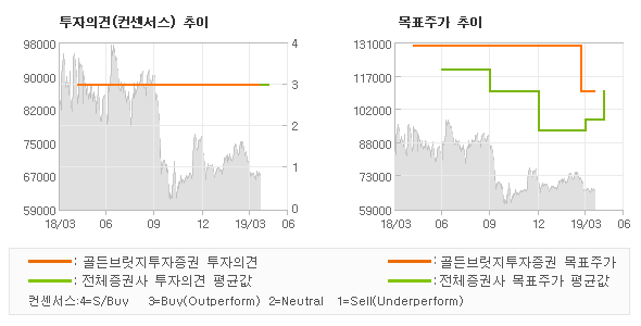 | 의견제시일자 | 증권사 | 투자의견 | 목표가 | | 20190416 | 골든브릿지투자증권 | BUY(유지) | 110,000 | | 20190128 | 한국투자증권 | 매수(유지) | 85,000 |