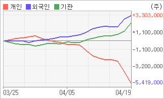 | 외국인/기관 순매수, 개인은 순매도(한달누적) 전일까지 기관이 8일 연속, 외국인이 3일 연속 각각 동종목을 순매수 했다. 4주간을 기준으로 보면 외국인이 초반에 동종목을 순매수한 이후에 기세를 이어가며 3,302,404주를 순매수했고, 기관도 순매도를 기록하다가 다시 순매수로 돌아서면서 2,312,607주를 순매수했다. 반면 개인들은 매도쪽으로 방향을 잡으면서 5,418,220주를 순매도한 것으로 나타났다. |