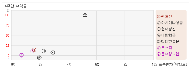| 위험대비 수익률 9.0으로 상위권, 업종지수와 비슷해 22일 오후 2시5분 현재 전일대비 2.88% 오른 4,820원을 기록하고 있는 팬오션은 지난 1개월간 14.49% 상승했다. 동기간 동안에 주가움직임의 위험지표인 표준편차는 1.6%를 기록했다. 이는 운수창고업 업종내에서 주요종목들과 비교해볼 때 팬오션의 월간 주가수익률은 상당히 높았던 반면에 변동성은 가장 낮았다는 뜻이다. 최근 1개월을 기준으로 팬오션의 위험을 고려한 수익률은 9.0을 기록했는데, 변동성이 가장 낮은 상태로 유지되었기 때문에 위험대비 수익률은 높은 수준을 유지했다. 또한 운수창고업업종의 위험대비수익률 8.2보다도 높았기 때문에 업종대비 성과도 긍정적이라고 할 수 있다. 다음으로 업종과 시장을 비교해보면 팬오션이 속해 있는 운수창고업업종은 코스피지수보다 변동성과 수익률이 모두 높은 모습이다. 다시 말하면 동업종에 탄력이 붙으면서 지수대비 초과상승했다는 의미이다. |