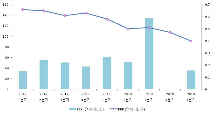 주가가 1주당 수익의 몇배가 되는지 나타내는 주가수익비율(PER)은 35.6배로 나타났다. 전년 동기 PER은 61.32배로 이번 분기에 하락했다.주가가 1주당 순자산의 몇배인지 알려주는 주가순자산비율인 PBR은 0.4배이다. 지난해 동기 PBR은 0.58배로 이번 1분기 PBR이 하락했다.